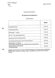 0368432 ‚Anlage 5 BMF -LA3- Entwurf eines Zeitplans GE Absenkung Energiesteuer Koalitionsinitiative Stand: 29.03.22 L | ‚Termin Kabinettbeschluss 27.04.22 Fraktionsbeschluss | 10.05.22 Bundestag, 1. Lesung 13.05.22 jun — BT-FA 1. Dog. (Vorratsbeschluss) 11.05.22 - Anhörung im BT-Finanzausschuss 16.05.22 Abschließende Beratung im BT-Finanzausschuss 18.05.22 Bundestag, 2./3. Lesung 19.05.22 (Fristverzicht erforderlich oder 2/3-Mehrheit der Anwesenden) Ba Beschlussfassung Bundesrat 20.05.22 (Fristverkürzung) Hinweis: Üblicherweise wird eine zusätzliche Beratung im Finanzausschuss anberaumt. Dieser Termin müsste hier entfallen. Ggfs. ist begleitende politische Kommunikation sinnvoll.