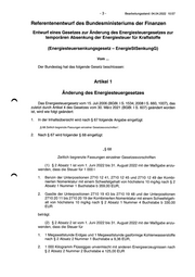-3- Bearbeitungsstand: 04.04.2022 10:57 Referentenentwurf des Bundesministeriums der Finanzen Entwurf eines Gesetzes zur Änderung des Energiesteuergesetzes zur temporären Absenkung der Energiesteuer für Kraftstoffe (Energiesteuersenkungsgesetz — EnergieStSenkungG) Vom ... Der Bundestag hat das folgende Gesetz beschlossen: Artikel 1 Änderung des Energiesteuergesetzes Das Energiesteuergesetz vom 15. Juli 2006 (BGBl. IS. 1534; 2008 I S. 660, 1007), das zuletzt durch Artikel 4 des Gesetzes vom 30. März 2021 (BGBl. | S. 607) geändert worden ist, wird wie folgt geändert: 1. In der Inhaltsübersicht wird nach $ 67 folgende Angabe eingefügt: „8 68 Zeitlich begrenzte Fassungen einzelner Gesetzesvorschriften“. 2. Nach $ 67 wird folgender 8 68 eingefügt: „8 68 Zeitlich begrenzte Fassungen einzelner Gesetzesvorschriften (1) 82 Absatz 1 ist vom 1. Juni 2022 bis 31. August 2022 mit der Maßgabe anzu- wenden, dass die Steuer für 1 000 I 1. Benzin der Unterpositionen 2710 12 41, 2710 12 45 und 2710 12 49 der Kombi- nierten Nomenklatur mit einem Schwefelgehalt von höchstens 10 mg/kg nach & 2 Absatz 1 Nummer 1 Buchstabe b 359,00 EUR, 2. Gasöle der Unterpositionen 2710 19 43 bis 2710 19 48 und der Unterpositionen 271020 11 bis 2710 20 19 der Kombinierten Nomenklatur mit einem Schwefelgeh- alt von höchstens 10 mg/kg nach $ 2 Absatz 1 Nummer 4 Buchstabe b 330,00 EUR beträgt. (2) 8 2 Absatz 2 ist vom 1. Juni 2022 bis 31. August 2022 mit der Maßgabe anzu- wenden, dass die Steuer für 1. 1 Megawattstunde Erdgas und 1 Megawattstunde gasförmige Kohlenwasserstoffe nach & 2 Absatz 2 Nummer 1 Buchstabe a 9,36 EUR, 2. 1000 Kilogramm Flüssiggas unvermischt mit anderen Energieerzeugnissen nach & 2 Absatz 2 Nummer 2 Buchstabe e 125,00 EUR