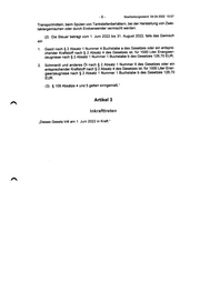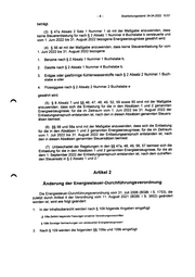 -6- Bearbeitungsstand: 04.04.2022 10:57 Transportmitteln, beim Spülen von Tankstellenbehältern, bei der Herstellung von Zwei- taktergemischen oder durch Endverwender vermischt werden. (2) Die Steuer beträgt vom 1. Juni 2022 bis 31. August 2022, falls das Gemisch ein 1. Gasöl nach $ 2 Absatz 1 Nummer 4 Buchstabe a des Gesetzes oder ein entspre- chender Kraftstoff nach $ 2 Absatz 4 des Gesetzes ist, für 1000 Liter Energieer- zeugnisse nach $ 2 Absatz 1 Nummer 1 Buchstabe b des Gesetzes 126,70 EUR, 2. Schmieröl und anderes Öl nach & 2 Absatz 1 Nummer 6 des Gesetzes oder ein entsprechender Kraftstoff nach $ 2 Absatz 4 des Gesetzes ist, für 1000 Liter Ener- gieerzeugnisse nach $ 2 Absatz 1 Nummer 1 Buchstabe b des Gesetzes 126,70 EUR. (3) $ 109 Absätze 4 und 5 gelten sinngemäß.“ Artikel 3 Inkrafttreten „Dieses Gesetz tritt am 1. Juni 2022 in Kraft.“