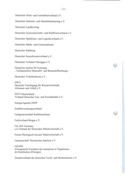 - 12 - Deutscher Hotel- und Gaststättenverband e.V. Deutscher Industrie- und Handelskammertag e. V. Deutscher Landkreistag Deutscher Genossenschafts- und Raiffeisenverband e.V. Deutscher Speditions- und Logistikverband e.V. Deutscher Städte- und Gemeindebund Deutscher Städtetag Deutscher Steuerberaterverband e. V. Deutscher Verband Flüssiggase.V. Deutsches Institut für Normung - Fachausschuss Mineralöl- und Brennstoffnormung - Deutsches Verkehrsforum e. V. DWA Deutsche Vereinigung für Wasserwirtschaft, Abwasser und Abfalle.V. EFET-Deutschland Verband Deutscher Gas- und Stromhändler e.V. EnergieAgentur.NR W Erdöl bevorratungsverband Fachgemeinschaft Kraftmaschinen Fachverband Biogase.V. FIL-IDF Germany c/o Verband der Deutschen Milchwirtschaft e.V. Forum Ökologisch-Soziale Marktwirtschaft e.V. Gemeinschaft Thermisches Spritzen e.V. GEODE (Groupement Europeen des entreprises et Organismes de Distribution d'Energie) Gesamtverband der deutschen Textil- und Modeindustrie e.V.