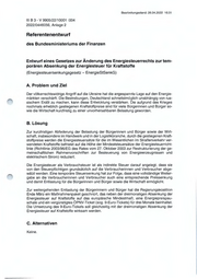 -3- Formulierungshilfen einen politischen Zusatz zur zeitlichen Verknüpfung der Energiesteuerentlastung und des 9-Euro Tickets aufnehmen. Die Absenkung der Energiesteuer auf Kraftstoffe soll gleichzeitig wirksam werden und daher ebenfalls in den Monaten Juni bis August 2022 erfolgen. Dem Bundesministerium der Justiz (BMJ) wurde der Gesetzentwurf zur rechtsförmlichen und rechtssystell')atischen Prüfung übersandt (Rechtsprüfung nach § 46 Abs. l GGO). Der Nationale Normenkontrollrat (NKR) wurde beteiligt. Er hat im Rahmen seines gesetzli~hen Prüfauftrags keine Einwände gegen den Gesetzentwurf erhoben. Der Bundesbeauftragte für Wirtschaftlichkeit in der Verwaltung wurde ebenfalls beteiligt. Der Gesetzentwurf wird nicht von der Bundesregierung, sondern über die Koalitionsfraktionen in den Bundestag eingebracht. Eine förmliche Beteiligung der Verbände nach§ 47 GGO ist insoweit entbehrlich. Gleichwohl wurde der Gesetzentwurf den betroffenen Verbänden zur Kenntnis gegeben, um eine breite Akzeptanz und Einstellung der Wirtschaft auf die befristete Maßnahme zu ermöglichen sowie die Umsetzung der Maßnahme durch die Mineralölwirtschaft zu gewährleisten. 3. Verbliebene Konfliktpunkte mit den Ressorts Keine. ·4. Weitere Informationen Unter Berücksichtigung der unterschiedlichen Lebenssituation von Frauen und Männern sind keine Auswirkungen erkennbar, die gleichstellungspolitischen Zielen gemäß§ 2 der Gemeinsamen Geschäftsordnung der Bundesministerien zuwiderlaufen. Die Beschlussfassung zu dem Gesetzentwurf soll vom Bundeskabinett am 27. April 2022 erfolgen. Das Gesetz soll am 1. Juni 2022 in Kraft treten. Das Gesetz bedarf nicht der Zustimmung des Bundesrates .. Die Referate LA 3, L B 2, Z A 3, 1 A 2, I A 6, J B 2, II A 5, I1I A 1, m B 4, IlI C 2, VIA 1 und E A 8 haben m1tgezeichnet. Dr. Hufen II. Entwurf