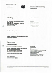 Betreff: WG: mdBu Billigung und Weiterleitung - WG: 13. Sitzung des Finanzausschusses des Deutschen Bundestags am 18. Mai 2022 - ENTWURF DER TAGESORDNUNG (T.: 13.5., 15 Uhr) Liebe Frau Reukauf, Vorlage i.V. ALin III ohne Änderung gebilligt. Viele Grüße Dirk Bremer -----Ursprüngliche Nachricht----- Von: Kuhn Dr., Anja (111B 2) <Anja.Kuhn@bmf.bund.de> Gesendet: Donnerstag, 12. Mai 2022 09:44 An: Abteilungsleiterin III <lll@bmf.bund.de> Ce: Szammetat, Melanie (111C 5) <Melanie.Szammetat@bmf.bund.de>; Hufen Dr., Christian (111B 3) • <Christian.Hufen@bmf.bund.de>; Weihs, Anja (111B 3) <Anja.Weihs@bmf.bund.de>; Kersten, Madeleine (111 B) <Madeleine.Kersten@bmf.bund.de> Betreff: WG: mdBu Billigung und Weiterleitung - WG: 13. Sitzung des Finanzausschusses des Deutschen Bundestags am 18. Mai 2022 - ENTWURF DER TAGESORDNUNG (T.: 13.5., 15 Uhr) AL III i.V. Lieber Herr Bremer, anliegender Sprechzettel i.V. UAL III B gebilligt und mdBu Billigung. Vielen Dank und Grüße Anja Kuhn -----Ursprüngliche Nachricht----- Von: Szammetat, Melanie (111C 5) <Melanie.Szammetat@bmf.bund.de> Gesendet: Mittwoch, 11. Mai 2022 17:59 An: Unterabteilungsleiter 111B <IIIB@bmf.bund.de> Ce: Kuhn Dr., Anja (III B 2) <Anja.Kuhn@bmf.bund.de>; Hufen Dr., Christian (111B 3) <Christian.Hufen@bmf.bund.de>; Weihs, Anja (111B 3) <Anja.Weihs@bmf.bund.de>; Herzog, Andre (111B 3) <Andre.Herzog@bmf.bund.de>; Schürle, Carola (111B 3) <Carola.Schuerle@bmf.bund.de>; Ebner, Klaus (111 B 3) <Klaus.Ebner@bmf.bund.de> Betreff: mdBu Billigung und Weiterleitung - WG: 13. Sitzung des Finanzausschusses des Deutschen Bundestags am 18. Mai 2022 - ENTWURF DER TAGESORDNUNG (T.: 13.5., 15 Uhr) Sehr geehrte Frau Dr. Kuhn, beigefügten Sprechzettel zu TOP 3 für die 13. Sitzung des Finanzausschusses am 18. Mai 2022 übersende ich Ihnen mit der Bitte um Billigung i.V. UALin III Bund Weiterleitung an Herrn Bremer i.V. für ALin lII ebenfalls mit der Bitte um Billigung. Mit freundlichen Grüßen Melanie Szammetat Referat lII C 5 Telefon Durchwahl: 2923 -----Ursprüngliche Nachricht----- Von: Jansen, Helmut (IV A 2) <Helmut.Jansen@bmf.bund.de> Gesendet: Mittwoch, 4. Mai 2022 13:31 An: Referat IV A3 <IVA3@bmf.bund.de>; Myßen Dr., Michael (IV A 3) <Michael.Myssen@bmf.bund.de>; Baum, Michael (IV A 3) <Michael.Baum@bmf.bund.de>; Landgraf, Susanne (IV A 3) <Susanne.Landgraf@bmf.bund.de>; Rohde, Eva (IV A 3) <Eva.Rohde@bmf.bund.de>; Büker, Kristin (IV A 3)