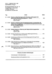 Il B3- V 9905/22/10001 :006 2022/0566633, Anlage 1 Bundesgesetzblatt Teil I Nr. 18 Ausgabetag: 31. Mai 2022 Umfang: 48 Seiten ab Seite 801 bis Seite 848 Tag Inhalt Seite 24. 5.2022 Gesetz zur Beschleunigung des Einsatzes verflüssigten Erd- gases (LNG-Beschleunigungsgesetz — LNGG;) ....................-..-- 802 FNA: neu: 752-13 GESTA: E009 24. 5.2022 Gesetz zur Änderung des Energiesteuerrechts zur temporären Ab- senkung der Energiesteuer für Kraftstoffe (Energiesteuersenkungs- gesetz — EnergieStSenkG) .................-.....-.--.u4us0snennenenenenneneen 810 FNA: 612-20, 612-20-1 GESTA: D019 25. 5.2022 Siebtes Gesetz zur Änderung des Regionalisierungsgesetzes ........ 812 FNA: 9240-3 GESTA: J003 25. 5.2022 Sechste Verordnung zur Änderung der Mitteilungsverordnung ............. 816 FNA: 610-1-8, 610-1-8, 610-1-8 25. 5.2022 Verordnung zur Änderung der Entschädigungseinrichtungs-Finan- zierungsverordnung ..........24444444444Hnnnennnnnennnnnenennnsnnennnenensnnsnssnnnnen 818 FNA: 7610-20-1 25. 5.2022 Dritte Verordnung zur Änderung von Vordrucken für das arbeitsge- richtliche Mahnverfahren (3. AGMahnVordrVAndV) ..............-..-22020> 823 FNA: 320-1-1 25. 5.2022 Bekanntmachung zu den Pfändungsfreigrenzen 2022 nach $ 850c der Zivilprozessordnung (Pfändungsfreigrenzenbekanntmachung 2022) .... 825 FNA: neu: 310-4-10-11 Hinweis auf andere Verkündungen Verkündungen im Bundesanzeiger ............44444440n0enensennansn nennen 847 Rechtsvorschriften der Europäischen Union .............--7rerse rss sn 847 LL———————