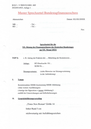 II B 3 - V 9905/22/10001 :005 2022/0514923, Anlage 1 Muster Sprechzettel Bundestasfinanzausschuss Aktenzeichen Datum: XX.XX.XXXX MR... - Tel; - RD ... - Tel. - Fax: Sprechzettel für die XX. Sitzung des Finanzausschusses des Deutschen Bundestages am XX. Monat 20XX TOPX: z. B. Antrag der Fraktion der..., Mitteilung der Kommission... Anlage: BT-Drucksache 1X/... KOM-Nr.... Sitzungsvertreter: (siehe Hinweise zur Sitzungsvertretung in der Anforderung) I. Votum Kenntnisnahme ODER Zustimmung ODER Ablehnung (ohne weitere Ausführungen) (Anträge der Opposition = immer Ablehnung!) entfällt bei Unterrichtungen und Selbstbefassungen II. Gesprächsführungsvorschlag „Times New Roman“ Größe 14 linker Rand 3 cm stichwortartig mit Aufzählungszeichen