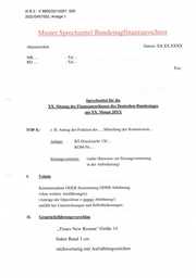 IIı B3 - V 9905/22/10001 :005 2022/0457552, Anlage 1 Muster Sprechzettel Bundestagfinanzausschuss Aktenzeichen Datum: XX.XX.XXXX MR... - Tel. - RD ... - Tel. - Fax: Sprechzettel für die XX. Sitzung des Finanzausschusses des Deutschen Bundestages am XX. Monat 20XX TOP X: z. B. Antrag der Fraktion der..., Mitteilung der Kommission... Anlage: BT-Drucksache IX/... KOM-Nr.... Sitzungsvertreter: (siehe Hinweise zur Sitzungsvertretung in der Anforderung) I. Votum Kenntnisnahme ODER Zustimmung ODER Ablehnung (ohne weitere Ausführungen) (Anträge der Opposition = immer Ablehnung!) entfällt bei Unterrichtungen und Selbstbefassungen 1. Gesprächsführungsvorschlag „Times New Roman“ Größe 14 linker Rand 3 cm stichwortartig mit Aufzählungszeichen