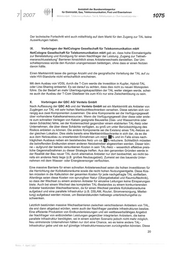 Amtsblatt der Bundesnetzagentur 2 für Elektrizität, Gas, Telekommunikation, Post und Eisenbahnen i va FI DNNT ” Mitteilungen. Telekommunmkation. Teil A, Mitteilungen der Bundesnatro } f AI f Yitteiungen EROMMUMIKANON, Ten A, Miterllungen ger Bundesmelzausntean Ä | a A 8 Marktzutrittsschranken und Expansionshemmnisse seien für alle Unternehmen in bereits durch eine Infrastruktur besetzten Gebieten existent. So baue die DT AG in Gebieten, die ein City Carrier exklusiv erschlossen habe, keine eigene Infrastruktur mehr aus. In Gebieten oh- ne Infrastruktur wirke sich die marktbeherrschende Stellung der DT AG in den Endkunden- märkten dahingehend aus, dass für sie das ökonomische Risiko eines Ausbaus wesentlich geringer sei als für andere Unternehmen. Behinderungsstrategien gegen einen parallelen Ausbau von TAL-Infrastruktur seien nicht bekannt, welche aufgrund der geschilderten Wechsel- und Eintrittsbarrieren auch nicht nötig seien. Die wettbewerblichen Verhältnisse seien auf dem Markt wesentlich stärker zementiert als auf den nachgelagerten Märkten. Eine graduelle Veränderung der Verhältnisse sei nur durch glasfaserbasierte Anschlüsse möglich. Für die Erstellung des Glasfaserausbaus gelte die DT AG infrastrukturtechnisch als am besten positioniertes Unternehmen (noch vor den Tele- kommunikationstöchtern von Stadtwerken und Regionalversorgern). Es bestehe jedoch kein Anlass, dass die DTAG dem eigenen „Monopolprodukt* Konkurrenz mache, so dass vor die- sem Hintergrund umwälzende Veränderungen auf diesem Markt in den nächsten Jahren nicht zu erwarten seien. xl. Vorbringen der Versatel-Gruppe Die Versatel-Gruppe sieht keine realistische Alternative zur Anmietung von TAL von einem anderen Netzbetreiber als der DT AG. Sie sei auf dem Markt praktisch alleinige Anbieterin von Leistungen, es herrsche kein wirksamer Wettbewerb. xl. Vorbringen der VSE NET GmbH Nach Auffassung der VSE NET GmbH sei es aufgrund der notwendigen Investitionen nicht nur in die TAL an sich, sondern auch in die entsprechenden Zuführungen ordnungspolitisch, aber auch volkswirtschaftlich unsinnig, den heute bestehenden Markt von Teilnehmeran- schlussleitungen in größerem Umfang durch den Aufbau von eigener Infrastruktur zu substi- tuieren. Anders sehe es bei der Ergänzung des heute bestehenden Teilnehmeranschlusslei- tungsnetzes in der gesamten Bundesrepublik Deutschland aus. Punktuell könne es bei ge- eigneten Baumaßnahmen u.U. auch für einen Teilnehmernetzbetreiber sinnvoll sein, TAL zu bauen oder bauen zu lassen. Da es im Wesentlichen nur einen Anbieter für den Zugang zur TAL gebe, gebe es eine er- hebliche Barriere, den Anbieter zu wechseln. Daher gebe es in diesem Bereich de facto kei- nen Weitbewerb, so dass die Teilnehmernetzbetreiber auf die Vorleistung des Zugangs zur TAL angewiesen seien. Daran werde auch der technische Fortschritt nichts ändern. xl. Vorbringen der WiTCOM GmbH Die WiTCOM GmbH vermarktet als Dienstleister . Der genann- te Markt werde nicht weiter ausgebaut. Die Investitionskosten würden in keinem Verhältnis zu den eventuell möglichen Einnahmen stehen. Die vorhandene Infrastruktur solle weiter genutzt werden. Im Versorgungsgebiet könne alternativ nur auf die Infrastruktur der der DT AG zurückgegriffen werden. Die DT AG besitze eine hohe Dominanz und sei alleiniger Marktführer. XIV. Vorbringen der WOBCOM GmbH Wolfsburg Nach Auffassung der WOBCOM GmbH Wolfsburg bestehe keine Möglichkeit, auf dem Markt neu tätig zu werden. Regional begrenzte Alternativnetze seien für Netzbetreiber ge- genüber dem bundesweit flächendeckenden T-COM-Netz wesentlich uninteressanter. Auch 21