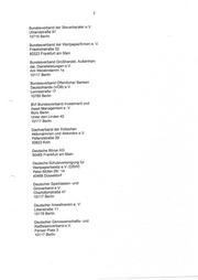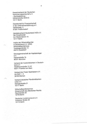 Bundesverband der Steuerberater e.V. Uhlandstraße 97 10715 Berlin Bundesverband der Wertpapierfirmen e. V. Friedrichstraße 52 60323 Frankfurt am Main Bundesverband Großhandel, Außenhan- del, Dienstleistungen e.V. Am \WVeidendamm 1a 10117 Berlin Bundesverband Öffentlicher Banken Deutschlands (VÖB) e.V. Lennästraße 17 10785 Berlin BVI Bundesverband Investment und Asset Management e.V. Büro Berlin - Unter den Linden 42 10117 Berlin Dachverband der Kritischen Aktionärinnen und Aktionäre e.V. Pellenzstraße 39 50823 Köln Deutsche Börse AG 60485 Frankfurt am Main Deutsche Schutzvereini gung für Wertpapierbesitz e.V. (DSW) Peter-Müller-Str. 14 40468 Düsseldorf Deutscher Sparkassen- und Giroverband eV. Charlottenstraße 47 10117 Berlin Deutscher Anwaltverein e. V. Littenstraße 11 10179 Berlin Deutscher Genossenschafts- und Raiffeisenverband eV. Pariser Plalz 3 410117 Berlin