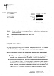Bundesministerium derlustiz POSTANSCHEGET Basıceamminiatietsi der Jusiiz, "FHly13 Barlin . Nu ner E-Mail - Hagsanschaift . Mahrensiralle 37, 10117 Berin BUT PET Era. = oo. FOSTANSCHAFT 11015 Berlin An die Verbände | BEARBEITET VON und Fachkreise De ter (+49 30) 185 tt Eiäl AKTEnzEiHeN 39010240000140001 parım Berlin, 14. März 2023 Betreff: Entwurf einer Zweiten Verordnung zur Andstung der Zertifizierte-Mediatoren- -Aus- bildungsverordnung hier: Gelegenheit zur Stellungnahme; Frist: 28.04.2023 Anlg.: -2- Sehr geehrte Damen und Herren, als Anlagen übersende ich den Referentenentwurf einer Zweiten Verordnung zur Änderung lediatoren-Ausbildungsverordnung nebst Bestandsrechtssynopse. der Zertifizierte-I Mit. dem Entwurf soll die Ausbildung den Anforderungen der Praxis besser gerecht werden: s Die bislang dem theoretischen Ausbildungslehrgang nachgelagerten vier supervidierten Praxisfälle sollen zeitlich vorgezogen und mit in die Ausbildung integriert werden. « Die Ausbildungsinstitute sollen die Teilnahme an einer den Anforderungen entsprechen- den Ausbildung bescheinigen. Die Bescheinigung ist Voraussetzung dafür, dass sich . eine Mediatorin bzw. ein Mediator als „zertifiziert‘ bezeichnen darf. Die Berechtigung, sich als „zertifiziert' zu bezeichnen, soll entfallen, wenn die nach der ZUSBaHAUS DW ch ÜEFERAÄNSCHRIFT Kravierstalle 18T Brio VERKEHRSANGINDUNG | UBshöhefFassesgleipkatz (2)