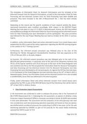 HORIZON 2020 – 101021851 – NESTOR D8.9 – GEN-Requirement No.9 The templates of Information Sheet for Research Participation and the template of the Informed Consent Form for Research Participation, as well as the Information Sheet for Data Processing and the Informed Consent Form for Data Processing have been drafted and prepared. They were included in the D8.1 H-Requirement No. 1 that has been already submitted. Depending on the nature and the specific conditions of each research activity the above- mentioned documents were modified accordingly. With respect to the NESTOR Project Meeting that took place on June 15-17,2022 in Alexandroupoli, Greece, the PEO had drafted and modified accordingly the Information Sheet for Data Processing and the Informed Consent Form for Data Processing that were distributed to all the participants. The same procedure was followed for the next Project Meeting that was held on October 24-26, 2022, in Larnaca, Cyprus. In addition, online Information Sheet and online Informed Consent Form (check boxes) were prepared by the PEO as part of the online registration regarding the NESTOR training program in the context of T6.2 “Training Courses”. Furthermore, the informed consent procedure was followed prior to the start of the Workshop for ‘Border Management Standardization Roadmap’ that was organized on the 17th of February 2023, in Brussels, Belgium. As foreseen, the informed consent procedure was also followed prior to the start of the NESTOR pilot demonstrations. In particular, prior to the start of the Lithuanian maritime trial (T6.3), of the Cypriot maritime trial (T6.4) and prior to the start of the Greek-Bulgarian land and maritime trial (T6.5), the PEO prepared the Information Sheet for Research Participation and Data Processing and the Informed Consent Form for Research Participation and Data Processing that were distributed to all trial participants. As regards the VIP Day that took place in the framework of the Greek-Bulgarian land and maritime trial on the 16th of March 2023 in Alexandroupolis, Greece, the Information Sheet and the Informed Consent Form also included a confidentiality clause that was addressed to the external guests. Finally, online Information Sheet and online Informed Consent Form (check boxes) were prepared by the PEO as part of the NESTOR Demo Day & Final Workshop that will be held on 24th of April 2023 in Athens, Greece. • Data Protection Impact Assessments A risk assessment was conducted in order to evaluate the privacy risks in the framework of D8.3 POPD-Requirement No. 3. Following the risk assessment, an opinion of whether a Data Protection Impact Assessment (DPIA) is necessary according to Article 35 GDPR was included in that same deliverable. The assessment and the evaluation of the ethics/privacy risks took into consideration each data processing operation separately and based on these an opinion was drafted which considered necessary the conducting of a DPIA in two cases: (a) for the web monitoring operated by CENTRIC as part of T3.4 and (b) for the social media monitoring operated by CERTH as part of T3.4. ©NESTOR Consortium Page 19 of 28