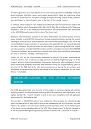 HORIZON 2020 – 101021851 – NESTOR D8.9 – GEN-Requirement No.9 The ethics guidelines accompanied the On-the-Job Training Guidelines drafted by STWS and aimed to ensure that both trainers and trainees would strictly follow the health and safety procedures and the misuse mitigation strategy during the training. Copies of the guidelines were distributed to the participants prior to the start of the training courses. In addition, Ethics Guidelines were drafted for the NESTOR pilot demonstrations based on the content of all the ethics deliverables (D8.1, D8.2, D8.3, D8.4, D8.5, D8.6 and D8.7). They were adapted to each one of the three pilot demonstrations and copies of them were distributed to the NESTOR Consortium prior to the start of the three trials. Moreover, the information included in the ethics deliverables was communicated and was made available to the NESTOR Consortium through dedicated sessions during the project meetings in order to ensure that the partners were aware of any ethical/legal risks and of the recommended or necessary actions in accordance with applicable EU and national laws and the ethics standards. Any ethical issues that were likely to appear during the NESTOR project were discussed first amongst the EtAB members and then among the members of the NESTOR Consortium. Guidance was provided on a constant basis either when considered necessary by the EtAB or whenever asked by a NESTOR partner. Finally, the PEO and the EtAB members appointed for the NESTOR project monitored the research activities from an ethical and legal point of view both during the carrying out of the research activities (via ethics guidelines, Information Sheets and Informed Consent Forms, physical presence of the PEO and other EtAB members during the project meetings, physical presence of the PEO during the pilot demonstrations) and during the presentation and description of the research activities in the context of the project’s deliverables (via the Ethics Review Form/Table). 5 RECOMMENDATIONS BY THE ETHICS ADVISORY BOARD The EtAB was determined until the end of the project to continue aligning all activities including research and developments within the NESTOR project with ethical principles of the highest standard for research integrity as well as to ensure compliance with all applicable international, EU and national laws. The members of NESTOR Consortium were sufficiently informed about the ethical and legal issues that have arisen or were likely to arise in the framework of the NESTOR project and they followed the guidance provided by the EtAB. Concrete examples can be found in the analysis of the above-mentioned deliverables of the WP8 ‘Ethics Requirements’ in Section 3 as well as in the description of the general guidance provided to the NESTOR Consortium in Section 4. ©NESTOR Consortium Page 21 of 28