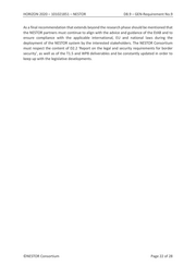 HORIZON 2020 – 101021851 – NESTOR D8.9 – GEN-Requirement No.9 As a final recommendation that extends beyond the research phase should be mentioned that the NESTOR partners must continue to align with the advice and guidance of the EtAB and to ensure compliance with the applicable international, EU and national laws during the deployment of the NESTOR system by the interested stakeholders. The NESTOR Consortium must respect the content of D2.2 ‘Report on the legal and security requirements for border security’, as well as of the T1.5 and WP8 deliverables and be constantly updated in order to keep up with the legislative developments. ©NESTOR Consortium Page 22 of 28