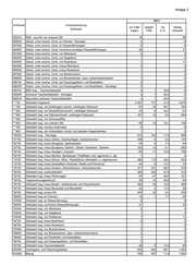 Anlage 3 2014 Schlüssel Kurzbezeichnung erf. Fälle aufgekl. Aq Häufig- Schlüssel insges. Fälle in % keitszahl 511000 Waren- und Warenkreditbetrug 292 193 66,1 455 511100 Betrügerisches Erlangen von Kfz 1 1 100,0 2 511200 Sonstiger Warenkreditbetrug 220 124 56,4 343 511201 Tankbetrug 151 54 35,8 235 511279 Weitere Arten des Warenkreditbetruges 69 70 101,4 108 511300 Warenbetrug 71 68 95,8 111 512000 Grundstücks- und Baubetrug 2 2 100,0 3 513000 Beteiligungs- und Kapitalanlagebetrug 1 1 100,0 2 513200 Anlagebetrug 1 1 100,0 2 513400 Beteiligungsbetrug 514000 Geldkreditbetrug 7 5 71,4 11 514100 Kreditbetrug § 265b StGB 514200 Subventionsbetrug 3 3 100,0 5 514300 Kreditbetrug § 263 StGB 4 2 50,0 6 515000 Erschleichen von Leistungen 91 91 100,0 142 515001 Beförderungserschleichung 90 90 100,0 140 515079 Sonstiges Erschleichen von Leistungen 1 1 100,0 2 516000 Betrug m. rechtsw. erl. unbarer ZM 48 24 50,0 75 516200 Betrug m. rechtsw. erl. Debitkarten ohne PIN (Lastschriftverfahren) 21 8 38,1 33 516300 Betrug m. rechtsw. erl. Debitkarten mit PIN 17 10 58,8 27 516400 Betrug m. rechtsw. erlangter Kreditkarten 6 4 66,7 9 516500 Betrug m. rechtsw. erl. Daten von Zahlungskarten 2 2 100,0 3 516900 Betrug m. rechtsw. erl. sonstiger unbarer ZM 2 3 517000 Sonstiger Betrug 259 181 69,9 404 517100 Leistungsbetrug 4 4 100,0 6 517200 Leistungskreditbetrug 10 9 90,0 16 517300 Arbeitsvermittlungsbetrug 2 2 100,0 3 517400 Betrug z.N.v. Versich. und Versich.missbrauch 1 1 100,0 2 517410 Betrug zum Nachteil von Versicherungen 1 1 100,0 2 517500 Computerbetrug (soweit nicht 5163 bzw. 5179) 9 7 77,8 14 517600 Provisionsbetrug 3 2 66,7 5 517700 Betrug z.N.v. Sozialversich. und SV-trägern 517800 (Sonstiger) Sozialleistungsbetrug (soweit nicht 5177) 55 55 100,0 86 517900 Betrug m. Zugangsber. zu Kommunikationsdiensten 3 1 33,3 5 518100 Abrechnungsbetrug 8 8 100,0 12 518110 Abrechnungsbetrug im Gesundheitswesen 4 4 100,0 6 518179 Sonstiger Abrechnungsbetrug 4 4 100,0 6 518200 Einmietbetrug 3 3 100,0 5 518300 Kontoeröffnungs- und Überweisungsbetrug 17 12 70,6 27 518310 Kontoeröffnungsbetrug 1 1 100,0 2 518320 Überweisungsbetrug 16 11 68,8 25 518400 Zechbetrug 1 2 518900 Sonstige weitere Betrugsarten 143 77 53,8 223 520000 Veruntreuungen 24 24 100,0 37 521000 Untreue 1 1 100,0 2 521079 Sonstige Untreue 1 1 100,0 2 522000 Vorenthalten und Veruntreuen von Arbeitsentgelt 23 23 100,0 36 530000 Unterschlagung 151 70 46,4 235 530079 Unterschlagung sonstiger Güter/Sachen gemäß §§ 246, 247 StGB - ohne von Kfz 140 59 42,1 218 531000 Unterschlagung von Kfz 11 11 100,0 17 540000 Urkundenfälschung 39 35 89,7 61 540001 Sonstige Urkundenfälschung 31 28 90,3 48 540002 Mittelbare Falschbeurkundung 2 1 50,0 3 540003 Verändern von amtl. Ausweisen