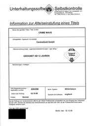 Unterhaltungssoftw Selbstkontrolle Förderverein für Jugend- und -sozialarbeit e.V. Rungestraße 25 , 10179 Berlin Tel. (030) 27962 11 Fax. (030) 279 63 01 Information zur Alterseinstufung eines Titels Name des gprüften Titels / Title / le titre CRIME WAVE Antragsteller / Applicant / le candidat CentreGold GmbH Alterseinstufung entspr. Jugendschutzbestimmungen: / age rating / Geeignet ab GEEIGNET AB 12 JAHREN 12Jahren ) Bemerkungen / Auflagen USK-Registriernummer / 2052/96 registration-number techn. System: SEGA-Saturn Datum der Prüfung: 02.10.96 . Sprache der Software: englisch Prüfart: Normal Bei der Prüfung von Vorabversionen (BETA) gilt dieser Prüfbescheid vorbehaltlich bis zum Eingang der Vollversion bei der USK. Senden Sie deshalb eine Verkaufsversion an das Büro der USK, da der Prüfbescheid sonst seine Gültigkeit verlieren kann. Für die USK gezeichnet Berlin, den 02.10.96