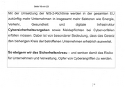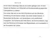 Seite 11 von 23 Ich bin davon überzeugt, dass es uns zudem gelingen wird, mit dem Gesetz die Resilienz von Wirtschaft und Bundesverwaltung gegenüber ‚Cybergefahren zu stärken. | Zum ersten Mal wird mit der NIS-2-Richtlinie auch die öffentliche | Verwaltung mit drei Ebenen erfasst. Die ersten beiden Ebenen, in | Deutschland die Bundes- und Länderebene, sind verpflichtend vorgegeben. Die Aufnahme der dritte Ebene, die Kommunalebene ‚ liegt nach der Richtlinie im Ermessen des MIGlIEOSTSAIS und innerstaatlich in der Kompetenz der Länder. jL