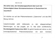 Seite 12 von 23 Sie sehen also, der Umsetzungsaufwand aber auch die Notwendigkeit dieser Schutzmechanismen in Deutschland ist beachtlich! ‚Ich möchte nun auf den Phänomenbereich „Cybercrime“ und das BKA Bezug nehmen. .‚Cyberkriminalität zählt mittlerweile zu den allgegenwärtigen ‚Bedrohungen, so das jüngste, am 13. Mai 2024. veröffentlichte, Bundeslagebiid Cybercrime 2023: Es gehört bereits seit Jahren zu den ‚kriminalpolizeilicen Phänomenbereichen mit dem höchsten I 12