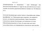 Seite 13 von 23 Schadenspotenzial in Deutschand - nach Erhebungen des 'Branchenverbandes Bitkom e.V. lagen für das Jahr 2023 die durch Cyber- ‚Angriffe verursachten gesamtwirtschaftlichen Schäden bei 148 Milliarden Euro. ‚Kriminelle Dienstleistungen werden hierbei im Geschäftsmodell „Crime- as-a-Service“ von Tätergruppierungen angeboten, die weitgehend | ‚anonym und dezentral zusammenarbeiten. Neben finanzstarken Unternehmen standen Einrichtungen und Institutionen mit hoher Öffentlichkeitswirksamkeit im Fokus. Es waren aber auch leicht verwundbare kleine und mittelständische Unternehmen stark betroffen. |"