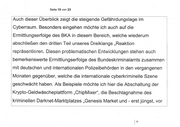 Seite 15 von 23 Auch dieser Überblick zeigt die steigende Gefährdungslage im | | | Cyberraum. Besonders eingehen möchte ich auch auf die wi | Ermittlungserfolge des BKA in diesem Bereich, welche wiederum ‚abschließen den dritten Teil unseres Dreiklangs ‚Reaktion . repräsentieren. Diesen problematischen Entwicklungen stehen auch bemerkenswerte Ermittlungserfolge des Bundeskriminalamts zusammen mit deutschen und internationalen Polizeibehörden in den vergangenen Monaten gegenüber, welche die internationale cyberkriminelle Szene geschwächt haben. Als Beispiele möchte ich hier die Abschaltung der Krypto-Geldwäscheplattform „ChipMixer“, die Beschlagnahme des kriminellen Darknet-Marktplatzes „Genesis Market und - erst jüngst, vor | 15 \