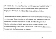 Seite 18 von 23 Wir möchte das immense Potenzial von Kl nutzen und zugleich hohe Standards setzen: für die digitale Souveränität der Bürgerinnen und Bürger, die IT-Sicherheit und den Schutz persönlicher Daten. Dabei ist es für uns wichtig, bestehende Initiativen miteinander enger zu vernetzen, auf diesen Strukturen aufzubauen und Doppelstrukturen zu vermeiden. Daneben werden wir mit z.B. dem Beratungszentrum Künstliche Intelligenz (BeKl) auch den KI-Kompetenzaufbau in der | Bundesverwaltung in der Breite unterstützen, um hierdurch die | Akzeptanz in die Technologie zu stärken. |”