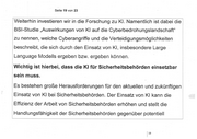 Seite 19 von 23 Weiterhin investieren wir in die Forschung zu Kl. Namentlich ist.dabei die BSI-Studie „Auswirkungen von Kl auf die Cyberbedrohungslandschaft“ zu nennen, welche Cyberangriffe und die Verteidigungsmöglichkeiten beschreibt, die sich durch den Einsatz von Ki, insbesondere Large : Language Modells ergeben bzw. ergeben können. | Wichtig ist hierbei, dass die Kl für Sicherheitsbehörden einsetzbar sein muss. | Es bestehen große Herausforderungen für den aktuellen und zukünftigen Einsatz von Kl bei Sicherheitsbehörden. Der Einsatz von Kl kann die Effizienz der Arbeit von Sicherheitsbehörden erhöhen und stellt die Handlungsfähigkeit der Sicherheitsbehörden gegenüber potentiell | 19