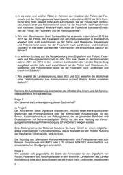 Landtag Brandenburg Drucksache 6/3025 6. Wahlperiode Antwort der Landesregierung auf die Kleine Anfrage 1199 des Abgeordneten Björn Lakenmacher der CDU-Fraktion Drucksache 6/2813 Netzabdeckung beim Digitalfunk in Brandenburg Wortlaut der Kleinen Anfrage 1199 vom 21.10.2015: Im Land Brandenburg gibt es diverse Funklöcher, da nicht genügend Funkmasten gesetzt wurden. Diese Funklöcher können im Ernstfall dazu führen, dass die Ein- satzkräfte von Polizei, Feuerwehr und Rettungsdiensten keine Unterstützung anfor- dern können. Der ungenügende Ausbau zeigt sich besonders bei der Nutzung der Handgeräte. Aufgrund der schwächeren Sendeleistung, im Vergleich zu den in Ein- satzfahrzeugen verbauten Geräten, kommt es öfter zu Funkausfällen. Laut dem Her- steller Motorola kommt es wegen der geringen Sendeleistung, im Zusammenhang mit dem ungenügenden Funkmastenausbau, immer wieder zu Ausfällen bei der mo- bilen Nutzung der Handgeräte. Für operativ arbeitende Kräfte stellt sich ein weiteres Problem bei der Nutzung der Handgeräte dar. Der menschliche Körper und die Klei- dung schwächen das Signal noch weiter ab. Deshalb nutzt das MEK und SEK wei- terhin die Möglichkeit einer Telefonkonferenz zum Kommunizieren. Dies ist nach zahlreichen Beschwerden über Funkausfälle und der damit auftretenden Gefährdun- gen der Beamten auch bei anderen operativen Kräften angedacht, wurde aber bisher aus Kostengründen nicht umgesetzt. Ich frage die Landesregierung: 1. Wie bewertet die Landesregierung diesen Sachverhalt? 2. Wie gestaltet sich gegenwärtig die Dichte der Funkmasten für den Digitalfunk von Polizei, Feuerwehr und Rettungsdiensten in den einzelnen Landesteilen des Lan- des Brandenburg (bitte auch aufschlüsseln bei der Polizei nach Direktionen, In- spektionen und Polizeirevieren sowie bei der Feuerwehr nach Landkreisen und kreisfreien Städten)? 3. In welchen Landesteilen ist die Netzabdeckung des Digitalfunkes von Polizei, Feuerwehr und Rettungsdiensten so dünn, dass Funklöcher vorhanden sind bzw. entstehen können (bitte auch aufschlüsseln bei der Polizei nach Direktionen, In- spektionen und Polizeirevieren sowie bei der Feuerwehr nach Landkreisen und kreisfreien Städten)?