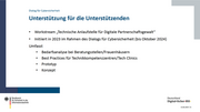 Dialog für Cybersicherheit Unterstützung für die Unterstützenden e \Workstream „Technische Anlaufstelle für Digitale Partnerschaftsgewalt“ °e Initiiert in 2023 im Rahmen des Dialogs für Cybersicherheit (bis Oktober 2024) Umfasst « Bedarfsanalyse bei Beratungsstellen/Frauenhäusern °e Best Practices für Technikkompetenzzentren/Tech Clinics ° Prototyp «e Konzept FR Bundesamt Deutschland für Sicherheit in der : ten l.Gi “RST. Informationstechnik Digital-Sicher-BSI 11.06.2024 | 11