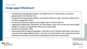 Brown etal. (2024) Design gegen Missbrauch Visuelle Benachrichtigungen darüber, wer Zugriff auf ein lIoT Device bzw. auf die dort gespeicherten Informationen hat. Visuelle Benachrichtigungen darüber, mit welchem Gerät von wem und wann zuletzt auf ein loT Device zugegriffen wurde Visuelle oder akustische Signale, die anzeigen, dass ein Sensor aktiv ist. Zugang über Webportale: Nachhalten von Information, wann und von wem der letzte Zugriff erfolgt ist. Hinweis auf Zugriff über Web auch auf dem Gerät Passwort-Zurücksetzen: MFA Interkonnektivität transparent gestalten: Verbinden sich loT-Geräte miteinander, kann das zu unerwünschten Nebeneffekten führen. Z.B. wenn ein Fitnesstracker sich unbemerkt mit dem Smartphone verbindet und die darauf empfangenen Nachrichten reproduziert. FR Ben ni; Deutschland u ür Sicherheit in der ioital»Si . . Informationstechnik Digi tal-Sicher-BSI 11.06.2024 | 13