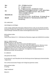 Grundsatz-, Rechts-, Personal- und Organisationsangelegenheiten der Bundespolizei Bundesministerium des Innern und für Heimat Alt-Moabit 140, 10557 Berlin Tel.: 030/18681-11836 E-Mail: Gregor.Gordzelewski@bmi.bund.de Von: R1_ <R1@bmi.bund.de> Gesendet: Montag, 16. Mai 2022 08:43 An: B1_ <B1@bmi.bund.de>; ZII3_ <ZII3@bmi.bund.de> Cc: R1_ <R1@bmi.bund.de>; RegR1 <RegR1@bmi.bund.de>; Gordzelewski, Gregor <Gregor.Gordzelewski@bmi.bund.de>; de Groot, Volker <Volker.deGroot@bmi.bund.de> Betreff: 220516 R1 an OE - 2te MZ-Runde - St-Vorlage AE anl. Schreiben MIK BB St G → Behördenzentrum BER | MIK Brandenburg R1-21011/11#2 Liebe Kolleginnen und Kollegen, wir bedanken uns für die u. s. MZ mit Änderungsvorschlägen. Diese haben wir weitestgehend übernommen und bitten nunmehr um MZ der beigefügten konsolidierten Fassung. In dem Dokument ist ein Kommentar/Streichungsbitte zur Aspekt der „vereinbarten Linie“ enthalten (Wo genau ist das denn vereinbart worden? Sonst bitte streichen). Diesbezüglich bitten wir um Prüfung und ggfs. Ergänzung bzw. Streichung. Ihrer MZ sehen wir bis *** HEUTE, 10.00 Uhr *** entgegen. Die Vorlage soll bis heute bis 15:00 Uhr dem Büro Stn S vorliegen.. Mit freundlichen Grüßen Im Auftrag André Ullrich Referat R1 Telefon: 030 18 681-10 360 E-Mail: andre.ullrich@bmi.bund.de Von: ZII3_ <ZII3@bmi.bund.de> Gesendet: Freitag, 13. Mai 2022 14:50 An: R1_ <R1@bmi.bund.de>; Ullrich, André <Andre.Ullrich@bmi.bund.de> Cc: B1_ <B1@bmi.bund.de>; Gordzelewski, Gregor <Gregor.Gordzelewski@bmi.bund.de>; Lorenz, Agnes Maria <AgnesMaria.Lorenz@bmi.bund.de>; Budelmann, Hannes, Dr. <Hannes.Budelmann@bmi.bund.de> Betreff: AU // AW: 220511 R1 an OE Bu MZ St-Vorlage AE anl. Schreiben MIK BB St G → Behördenzentrum BER | MIK Brandenburg