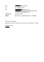 Von: <E Op 01 izei.bund.de> An: B1_ <B1@bmi.bund.de> CC: <E opolizei.bund.de>; < Op >!izei.bund.de>; Gordzelewski, Gregor <Gregor.Gordzelewski@bmi.bund.de> Gesendet am: 25.05.2022 07:28:33 Betreff: Bericht_BPOL - Liegenschaften BPOL B1 - 14000/4#1 71 Sehr geehrter Herr Gordzelewski, hiermit lege ich den Bericht der Bundespolizei zu dem Erlass vom 17.05.2022 (BPOL B1 - 14000/4#1) vor. Mit freundlichen Grüßen Im Auftrag