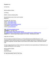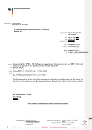MR Bundespolizeipräsidium POSTANSCHRIFT Bundespolizeipräsidium Heinrich-Mann-Allee 103, 14473 Potsdam Bundesministerium des Innern und für Heimat Referat B1 POSTANSCHRIFT Heinrich-Mann-Allee 103 14473 Potsdam teL +49 331 9799 FAX +49 331 9799 BEARBEITETVON EEE E-MAıL bpolp@polizei.bund.de INTERNET www.bundespolizei.de DATUM Potsdam, 25.05.2022 cz P-100011_P-Ref_71_00004#0002#0006 serrerfr Liegenschaften BPOL - IFG-Anfrage zum geplanten Behördenzentrum am BER !/ Informati- onen zu Gesprächen des Bundes mit der Harder Ny GmbH Her Bericht BPOL sezus Erlass BMI B1-14000/4#1 vom 17. Mai 2022 ANLAGE = Zu dem Bezugserlass berichte ich wie folgt: Der Bundespolizei liegen keine Informationen zu Gesprächen des Bundes mit der Harder Ny GmbH vor. Es werden von der Bundespolizei keine Gespräche mit dem Unternehmen geführt. Mit freundlichen Grüßen Im Auftrag Dieses Dokument wurde elektronisch erstellt und bedarf keiner Unterschrift. Gelös BANKVERBINDUNG Bundeskasse - Dienstort Kiel ZUSTELL- UND LIEFERANSCHRIFT Heinrich-Mann-Allee 103, 14473 Potsdam ; Deutsche Bundesbank Filiale Hamburg Haus 44 IBAN DE18 2000 0000 0020 0010 66 VERKEHRSANBINDUNG Straßenbahn Kunersdorfer Straße j I / BIC MARKDEF1200 Linien 91, 92, 93, 96, 99 Zertifikat seit/ 2014 audit berufundfamilie a2... Eahlarl I inkrafarans ıınnaıltin . . -. .-. u ame v