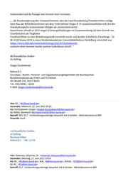 Insbesondere auf die Passage zum Investor wird verwiesen. „….die Bundesregierung den Umstand bewertet, dass das Land Brandenburg Presseberichten zufolge beim Bau des Behördenzentrums mit dem Unternehmer Jürgen B. H. zusammenarbeiten will, den der brandenburgische Innenminister Stübgen als „hinreichend seriös“ bezeichnete, obwohl er 2015 wegen Schmiergeldzahlungen im Zusammenhang mit dem Erwerb von Grundstücken am Flughafen Frankfurt/Main zu einer Bewährungsstrafe verurteilt wurde und darüber Schriftliche Einzelfrage - 22- 06-0128 hinaus 2019 in einen Medizinskandal am Universitätsklinikum Heidelberg verwickelt war (https://www.rbb24.de/wirtschaft/beitrag/2022/05/berbehoerde- zentrum-streit-investor-harder-partner-hallenbauer.html)?...“ Mit freundlichen Grüßen Im Auftrag Gregor Gordzelewski Referat B 1 Grundsatz-, Rechts-, Personal- und Organisationsangelegenheiten der Bundespolizei Bundesministerium des Innern und für Heimat Alt-Moabit 140, 10557 Berlin Tel.: 030/18681-11836 E-Mail: Gregor.Gordzelewski@bmi.bund.de Von: B1_ <B1@bmi.bund.de> Gesendet: Mittwoch, 22. Juni 2022 09:01 An: Gordzelewski, Gregor <Gregor.Gordzelewski@bmi.bund.de> Cc: Hölter, Bernhard <Bernhard.Hoelter@bmi.bund.de> Betreff: WG: EILT - Vorbereitungsunterlage Gespräch mit St Schüler - Behördenzentrum BER Priorität: Hoch mit freundlichen Grüßen im Auftrag Bernhard Hölter Referat B 1 - HR: 11720 Von: Stawowy, Johannes, Dr. <Johannes.Stawowy@bmi.bund.de> Gesendet: Dienstag, 21. Juni 2022 19:24 An: B1_ <B1@bmi.bund.de>; ALB_ <B@bmi.bund.de>; SVALB_ <SVB@bmi.bund.de> Cc: R1_ <R1@bmi.bund.de> Betreff: EILT - Vorbereitungsunterlage Gespräch mit St Schüler - Behördenzentrum BER