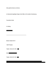 Sehr geehrter Damen und Herren, ich übersende beigefügte Anlage mit der Bitte um Ihre weitere Veranlassung Freundliche Grüße Im Auftrag Berliner Straße 98-101 14467 Potsdam Telefon +49 (0) 331 3702 - No: EABHUENEHNTETEBE Telefax +49 (0) 331 3102 -