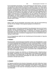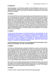- 53 - Bearbeitungsstand: 22.08.2023 21:14 Zu Nummer 10 Der Datenzugangs- und Koordinierungsstelle für Gesundheitsdaten werden die in § 2 GDNG festgelegten Aufgaben bei der Zusammenführung von Daten aus dem Forschungs- datenzentrum Gesundheit und den Daten der klinischen Krebsregister der Länder nach § 65c SGB V übertragen. Zu Absatz 3 Die Vorschrift enthält eine Verordnungsermächtigung des Bundesministeriums für Gesund- heit zur Regelung der dort genannten Einzelheiten. Bei der Erarbeitung der Rechtsverord- nung sind die betroffenen Datenhalter zu beteiligen und Benehmen herzustellen. Dies gilt insbesondere für die Krebsregister im Kompetenzbereich der Bundesländer. Zur Gewähr- leistung des für die Verarbeitung sensibler Gesundheitsdaten erforderlichen hohen Daten- schutz- und Datensicherheitsniveaus ist Benehmen mit dem Bundesbeauftragten für den Datenschutz und die Informationsfreiheit und dem Bundesamt für Sicherheit in der Informa- tionstechnik herzustellen. Eine Zustimmung des Bundesrates zur Rechtsverordnung ist nicht erforderlich, da nur Regelungen zur Datenzugangs- und Koordinierungsstelle für Ge- sundheitsdatengetroffen werden. Regelungen, die die Datenverknüpfung mit den Krebsre- gistern im Zuständigkeitsbereich der Länder betreffen sind ausschließlich in der Rechtsver- ordnung nach § 4 zu treffen. Zu Absatz 4 Zur Beratung der Datenzugangs- und Koordinierungsstelle für Gesundheitsdaten bei ihrer Aufgabenwahrnehmung sowie zur Koordinierung mit existierenden Datenhaltern und Ge- sundheitsdateninfrastrukturen wird ein Arbeitskreis eingerichtet. Ziel ist, effiziente Struktu- ren und Arbeitsweisen zu etablieren und insbesondere den Aufbau von Doppelstrukturen zu vermeiden. Um auch die Belange der Forschenden, der Leistungserbringer sowie der Patientinnen und Patienten angemessen zu berücksichtigen, werden auch Vertreter dieser Gruppen zur Teilnahme am Arbeitskreis eingeladen. Zu § 4 (Verknüpfung von Daten des Forschungsdatenzentrums Gesundheit und der klinischen Krebsregister der Länder nach § 65c SGB V) Zu Absatz 1 Um Fragen zu Krebserkrankungen umfassend beantworten zu können, muss die Verknüp- fung von Daten der klinischen Krebsregister der Länder nach § 65c SGB V mit Daten des Forschungsdatenzentrums Gesundheit rechtlich und technisch geregelt werden. Denn viele Forschungsfragen lassen sich erst durch das Zusammenführen von Daten aus beiden Quellen beantworten. So bieten zum Beispiel Abrechnungsdaten einen breiten Blick über Patientenpfade durch die unterschiedlichen Versorgungsbereiche und für diverse Krank- heitsbilder im Zeitablauf, während Daten der klinischen Krebsregister der Länder nach § 65c SGB V tiefgehende Informationen zu spezifischen Behandlungen eines Krankheitsbil- des erlauben. Nur die Verknüpfung erlaubt ein vollständiges Bild des Behandlungsverlaufs und der Kontextfaktoren, die Analyse von Früherkennungsmerkmalen oder die Identifika- tion von gesundheitsbedingten Risikofaktoren für bestimmte Krebserkrankungen. Die im Rahmen dieser Datenverknüpfung gewonnen Erkenntnisse dienen auch als erste Grundlage für eine zukünftige Datenverknüpfung zwischen dem Forschungsdatenzentrum Gesundheit nach § 303d des Fünften Buches Sozialgesetzbuch und dem Forschungsda- tenzentrum Gesundheit der gesetzlichen Rentenversicherung. Zu Absatz 2 In Absatz 2 werden Voraussetzungen für die Datenverknüpfung geregelt.