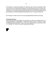 19 Das Gremium war insgesamt allerdings der Auffassung, dass mit den vorgenannten Texten zwar die Grenze zur Frauendiskriminierung auf den ersten Blick erreicht zu sein scheint, aber aufgrund der auch in diesen Texten enthaltenen, zahlreichen Überspitzungen und der durch- aus ironisch zu verstehenden Bedienung alter Klischees hier der bei allen Entscheidungen der Bundesprüfstelle zu berücksichtigenden Kunstfreiheit hier der Vorrang einzuräumen ist. Der Tonträger war daher nicht in die Liste der jugendgefährdenden Medien einzutragen. Rechtsbehelfsbelehrung Eine Klage gegen diese Entscheidung kann innerhalb eines Monats ab Zustellung beim Ver- waltungsgericht Köln, Appellhofplatz 1, 50667 Köln, erhoben werden. Die Klage ist gegen die Bundesrepublik Deutschland, vertreten durch die Bundesprüfstelle zu richten (§§ 25 Abs. 1, 2, 4 JuSchG; 42 VwGO). Sie hat keine aufschiebende Wirkung.