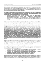 Landtag Brandenburg Drucksache 6/11695 2. Mit welchen Fördermöglichkeiten unterstützt das Ministerium für Infrastruktur und Lan- desplanung bei der Modernisierung oder den Neubau von Kindertagesstätten und Schu- len? In welchem Umfang wurden seit Beginn der 6. Wahlperiode welche Maßnahmen in den Landkreisen und kreisfreien Städten gefördert? zu Frage 2: Das Ministerium für Infrastruktur und Landesplanung (MIL) hat in der aktuellen Legislaturperiode durch folgende Programme Kommunen bei der Modernisierung oder den Neubau von Kindertagesstätten und Schulen gefördert: Sanierung und Umbau von Schulen und Kitas aus den Bund-Länder- Städtebauförderprogrammen „Soziale Stadt“, „Stadtumbau“, „Städtebaulicher Denkmalschutz“, „Aktive Stadt- und Ortsteilzentren“, „Kleinere Städte und Gemein- den“ sowie dem Investitionspakt Soziale Integration im Quartier (SIQ) (vgl. Anlagen 5 bis 8). Aufgrund des in der Städtebauförderung üblichen Bewilligungsverfahrens ist eine Erfas- sung für die exakte Legislaturperiode 2014 bis 2019 nicht möglich. Erfasst werden immer nur die Umsetzungsplanzeiträume 2015 bis 2017 und 2018 bis 2020. Im Rahmen der Städtebauförderung werden grundsätzlich städtebauliche Gesamtmaßnahmen zur Besei- tigung städtebaulicher Missstände (Substanz- und Funktionsschwäche) gefördert. Städte- bauliche Missstände liegen gemäß § 136 BauGB Abs. 2 Nr. 1 vor, wenn ein Gebiet nach seiner Bebauung oder nach seiner sonstigen Beschaffenheit den allgemeinen Anforderun- gen an gesunde Wohn- und Arbeitsverhältnisse oder an die Sicherheit der in ihm wohnen- den und arbeitenden Menschen nicht entspricht (Substanzschwäche). Weiterhin liegen städtebauliche Missstände gemäß § 136 BauGB Abs. 2 Nr. 1 vor, wenn ein Gebiet in der Erfüllung der Aufgaben erheblich beeinträchtigt ist (Funktionsschwäche). Die Kommunen setzen ihre Gesamtmaßnahmen eigenverantwortlich in einem abgestimmten Rahmen um. Diese setzen sich aus einer Anzahl von Einzelvorhaben zusammen, die jeweils in unter- schiedlicher Art und Weise zur Beseitigung der festgestellten Missstände beitragen. Inso- fern ist als Begründung für ein gefördertes Einzelvorhaben innerhalb einer städtebaulichen Gesamtmaßnahme generell die Beseitigung/Minderung städtebaulicher Missstände anzu- führen. 3. Mit welchen Fördermöglichkeiten unterstützt das Ministerium der Finanzen Investitionen in finanzschwachen Kommunen bei der Modernisierung oder den Neubau von Kinderta- gesstätten und Schulen? In welchem Umfang wurden seit Beginn der 6. Wahlperiode wel- che Maßnahmen in den Landkreisen und kreisfreien Städten gefördert? zu Frage 3: Das Ministerium der Finanzen (MdF) hat in der aktuellen Legislaturperiode durch folgende Programme Kommunen bei der Modernisierung oder den Neubau von Kindertagesstätten und Schulen gefördert: Förderung von Investitionen zur Verbesserung der Schulinfrastruktur in finanz- schwachen Kommunen durch die KInvFG 1-Richtlinie (vgl. Anlage 9) Förderung von Investitionen zur Verbesserung der Schulinfrastruktur in finanz- schwachen Kommunen durch die KInvFG 2-Richtlinie (vgl. Anlage 10) Kommunales Infrastrukturprogramm (KIP) - Bildung (vgl. Anlage 11). Auf Vorschlag des Finanzministers hat der Landtag im Dezember 2018 im Zuge der Haus- haltsgesetzgebung für die Jahre 2019/2020 zudem beschlossen, dass in § 16 des Haus- haltsgesetzes 2019/2020 ein neuer Absatz 6 eingefügt wird. Mit § 16 Abs. 6 des Haus- -2-