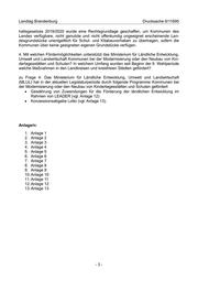 Landtag Brandenburg Drucksache 6/11695 haltsgesetzes 2019/2020 wurde eine Rechtsgrundlage geschaffen, um Kommunen des Landes verfügbare, nicht genutzte und nicht offenkundig ungeeignet erscheinende Lan- desgrundstücke unentgeltlich für Schul- und Kitabauvorhaben zu übertragen, sofern die Kommunen über keine geeigneten eigenen Grundstücke verfügen. 4. Mit welchen Fördermöglichkeiten unterstützt das Ministerium für Ländliche Entwicklung, Umwelt und Landwirtschaft Kommunen bei der Modernisierung oder den Neubau von Kin- dertagesstätten und Schulen? In welchem Umfang wurden seit Beginn der 6. Wahlperiode welche Maßnahmen in den Landkreisen und kreisfreien Städten gefördert? zu Frage 4: Das Ministerium für Ländliche Entwicklung, Umwelt und Landwirtschaft (MLUL) hat in der aktuellen Legislaturperiode durch folgende Programme Kommunen bei der Modernisierung oder den Neubau von Kindertagesstätten und Schulen gefördert: Gewährung von Zuwendungen für die Förderung der ländlichen Entwicklung im Rahmen von LEADER (vgl. Anlage 12) Konzessionsabgabe Lotto (vgl. Anlage 13). Anlage/n: 1. Anlage 1 2. Anlage 2 3. Anlage 3 4. Anlage 4 5. Anlage 5 6. Anlage 6 7. Anlage 7 8. Anlage 8 9. Anlage 9 10. Anlage 10 11. Anlage 11 12. Anlage 12 13. Anlage 13 -3-
