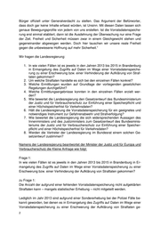 kommen sein soll. Insoweit wird auf die Beantwortung der Kleinen Anfrage Nr. 3370 (Landtag Brandenburg Drucksache 5/8678) Bezug genommen. Frage 2: Um welche Straftaten handelte es sich bei den einzelnen Fällen konkret? zu Frage 2: Auf die Antwort zu Frage 1 wird Bezug genommen. Frage 3: Welche Ermittlungen wurden auf Grundlage der vorliegenden gesetzlichen Regelun- gen durchgeführt? Frage 4: Welche Ermittlungsergebnisse konnten in den einzelnen Fällen erzielt werden? zu Fragen 3 und 4: Hinsichtlich der aus dem Jahr 2013 bekannt gewordenen Fälle wird auf die Beant- wortung der Fragen 3 und 4 der Kleinen Anfrage Nr. 3370 Bezug genommen. Allgemein gilt der Grundsatz der freien Gestaltung des Ermittlungsverfahrens, der beinhaltet, dass die Strafprozessordnung für die Durchführung des Ermittlungsver- fahrens keinen verbindlichen Ablauf vorgibt. Bei Vorliegen der jeweiligen formellen und materiellen Voraussetzungen stehen den Ermittlungsbehörden insbesondere die Ermittlungs- und Eingriffsbefugnisse der Strafprozessordnung zur Verfügung. Die Ermittlungsbehörden sind gehalten, die im Einzelfall erforderlichen Ermittlungsmaß- nahmen zur Erforschung des Sachverhalts vorzunehmen. Die jeweils erzielten Er- mittlungsergebnisse werden statistisch nicht erfasst. Frage 5: Wie bewertet die Landesregierung den Gesetzentwurf des Bundesministeriums der Justiz und für Verbraucherschutz zur Einführung einer Speicherpflicht und einer Höchstspeicherfrist für Verkehrsdaten? zu Frage 5: Bei der von der Bundesregierung beabsichtigten Einführung einer Speicherpflicht und einer Höchstspeicherfrist für Verkehrsdaten geht es um eine Abwägung gewich- tiger Rechtspositionen und Schutzgüter. Es liegt zwar im Interesse einer effizienten Strafverfolgung und Gefahrenabwehr, eine Vorratsdatenspeicherung und deren Ver- wendung möglichst weitgehend zuzulassen. Allerdings bestehen elementare Grund- rechte der Bürger auf Freiheit, auf Schutz ihrer Privatsphäre und auf Schutz perso- nenbezogener Daten, in die nur eingegriffen werden darf, wenn sich der Eingriff tat- sächlich auf das absolut Notwendige beschränkt.