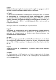Frage 6: Hält die Landesregierung die Vorratsdatenspeicherung für ein geeignetes und not- wendiges Instrument zur Gefahrenabwehr und Strafverfolgung? zu Frage 6: Aus der staatsanwaltschaftlichen Ermittlungspraxis wird mitgeteilt, dass bei bestimm- ten Deliktsgruppen die Ermittlung der einer Person zugeordneten sog. IP-Adresse von besonderer Bedeutung ist. Mangels Speicherung der IP-Adresse könne das Endgerät regelmäßig nicht identifiziert werden. Ermittlungen auf der Grundlage von § 100g StPO seien in ihrer Effizienz beeinträchtigt, da die Daten nicht mehr oder zu kurz gespeichert seien. Im Übrigen wird auf die Beantwortung der Frage 5 verwiesen. Frage 7: Wie bewertet die Landesregierung die sich widersprechenden Aussagen des Innen- ministers und des Justizministers zum Gesetzentwurf des Bundesministeriums der Justiz und für Verbraucherschutz zur Einführung einer Speicherpflicht und einer Höchstspeicherfrist für Verkehrsdaten? zu Frage 7: Für die Landesregierung stellen die konstruktive Auseinandersetzung mit den aktuel- len politischen und gesellschaftlichen Themen und die damit einhergehende Diskus- sion von Für und Wider wesentliche Grundbausteine ihres Demokratieverständnis- ses dar. Frage 8: Werden die Vertreter der Landesregierung im Bundesrat einem solchen Gesetzent- wurf zustimmen? zu Frage 8: Der Koalitionsvertrag enthält Regelungen zum Abstimmungsverhalten im Bundesrat. In der Plenarsitzung am 12. Juni 2015 hat die Landesregierung den Gesetzentwurf mit Enthaltung bewertet.