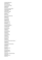 Stiftung zur Förderung der Deggendorfer Kinder Franz-Josef-Strauß-Straße 3 94469 Deggendorf Große Kreisstadt Selb Ludwigstraße 6 95100 Selb Markt Kasendorf Marktplatz 8 95359 Kasendorf Verwaltungsgemeinschaft Kasendorf Marktplatz 8 95359 Kasendorf Gemeinde Brand Hauptstraße 1 95700 Neusorg Gemeinde Ebnath Hauptstraße 1 95700 Neusorg Gemeinde Neusorg Hauptstraße 1 95700 Neusorg Gemeinde Pullenreuth Hauptstraße 1 95700 Neusorg Schulverband Fichtelnaabtal Mittelschule Hauptstraße 1 95700 Neusorg Verwaltungsgemeinschaft Neusorg Hauptstraße 1 95700 Neusorg Stadt Seßlach Marktplatz 97 96145 Seßlach Gemeinde Gundelsheim Karmelitenstraße 11 96163 Gundelsheim Markt Wonsees Marktplatz 4 96197 Wonsees Bezirk Unterfranken Silcherstraße 5 97074 Würzburg Zweckverband Fränkisches Freilandmuseum Fladungen Silcherstraße 5 97074 Würzburg Zweckverband Meisterschule Ebern für das Schreinerhandwerk Silcherstraße 5 97074 Würzburg Unterfränkische Kulturstiftung Silcherstraße 5 97076 Würzburg