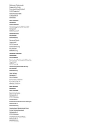 Stadt Oestrich-Winkel Paul-Gerhardt-Weg 1 65375 Oestrich-Winkel Zweckverband Hinterlandeswald Paul-Gerhardt-Weg 1 65375 Oestrich-Winkel Zweckverband Rheingau Rheinweg 30 65375 Oestrich-Winkel Gemeinde Schlangenbad Rheingauer Straße 23 65388 Schlangenbad Gemeinde Walluf Mühlstraße 40 65396 Walluf Berufsgenossenschaft Nahrungsmittel und Gastgewerbe Dynamostraße 7-11 68165 Mannheim Abwasserverband Unterer Neckar Hauptstraße 60 68535 Edingen-Neckarhausen Gemeinde Edingen-Neckarhausen Hauptstraße 60 68535 Edingen-Neckarhausen Gemeinde Nußloch Sinsheimer Straße 19 69226 Nußloch Abwasserverband Überwald der Gemeinden Grasellenbach und Wald-Michelbach In der Gass 17 69483 Wald-Michelbach Gemeinde Wald-Michelbach In der Gass 17 69483 Wald-Michelbach Landkreis Heilbronn Lerchenstraße 40 74027 Heilbronn Gemeinde Gemmingen Hausener Straße 1 75050 Gemmingen Gemeinde Sulzfeld (Baden) Rathausplatz 1 75056 Sulzfeld Gemeinde Tiefenbronn Gemmingenstraße 1 75233 Tiefenbronn Zweckverband Abwasserbeseitigung Biet Gemmingenstraße 1 75233 Tiefenbronn Gemeinde Kronau Kirrlacher Straße 2 76709 Kronau