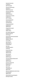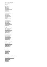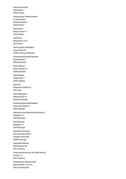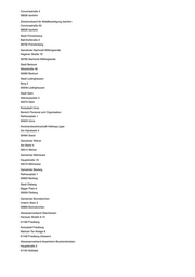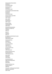 Abwasserverband Oberes Edertal Schulstraße 5 35108 Allendorf (Eder) Gemeinde Allendorf Schulstraße 5 35108 Allendorf (Eder) Verwaltungsgemeinschaft Allendorf (Eder) - Bromskirchen Schulstraße 5 35108 Allendorf (Eder) Abwasserverband Lauter-Wetter Friedrichstraße 11 35321 Laubach Stadt Laubach Friedrichstraße 11 35321 Laubach Sparkasse Gießen Johannesstraße 4-5 35390 Gießen Gemeindeverwaltungsverband Städteservice Laubach-Lich Unterstadt 1 35423 Lich Stadt Lich Unterstadt 1 35423 Lich Der Magistrat der Stadt Allendorf (Lumda) Bahnhofstraße 14 35469 Allendorf (Lumda) Gemeinde Ebersburg Schulstraße 3 36157 Ebersburg Gemeinde Grebenhain Hauptstraße 51 36355 Grebenhain Gemeinde Niederorschel Bergstraße 51 37355 Niederorschel Sparkasse Osterode am Harz Eisensteinstraße 8-10 37520 Osterode am Harz Stadt Einbeck Teichenweg 1 37574 Einbeck Kreishandwerkerschaft Region Braunschweig-Gifhorn Steinweg 50 38518 Gifhorn Sparkasse Jerichower Land Schartauer Straße 15 39288 Burg Trinkwasser- und Abwasserverband Genthin Rathenower Heerstraße 25 39307 Genthin