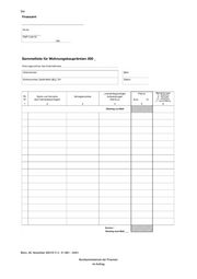 BStbl Seite 893 Wohnungsbau-Prämiengesetz Bekanntmachung des Vordruckmusters für die Sammelliste für Wohnungsbauprämien Nach § 4b Abs. 1 des Wohnungsbau-Prämiengesetzes in der Fassung der Bekanntmachung vom 30. Oktober 1997 (Bundesgesetz‐ blatt I S. 2678), zuletzt geändert durch Artikel 32 des Steuer-Euroglättungsgesetzes vom 19. Dezember 2000 (Bundesgesetzblatt I S. 1790), hat das Unternehmen den Antrag auf Wohnungsbauprämie für Aufwendungen im Sinne des § 2 Abs. 1 Nr. 2 bis 4 WoPG an das Wohnsitzfinanzamt des Prämienberechtigten weiterzuleiten. Nach Abschnitt 13 Abs. 1 Satz 2 der Wohnungsbau-Prämien‐ richtlinien 1996 kann das Unternehmen die Anträge zur Vereinfachung des Verfahrens in einer Sammelliste zusammenfassen. Das Vordruckmuster dieser Sammelliste wird hiermit bekannt gemacht.