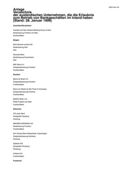 BStbl Seite 440 Anlage Verzeichnis der ausländischen Unternehmen, die die Erlaubnis zum Betrieb von Bankgeschäften im Inland haben (Stand: 28. Januar 1999) Australien/Neuseeland Australia and New Zealand Banking Group Limited Niederlassung Frankfurt am Main Frankfurt/Main Belgien Bank Brüssel Lambert AG Niederlassung Köln Köln Generale Bank Niederlassung Deutschland Köln KBC Bank N.V. Zweigniederlassung Frankfurt Frankfurt/Main Brasilien Banco do Brasil S.A. Zweigniederlassung Frankfurt Frankfurt/Main Banco do Estado de São Paulo S.A.banespa Zweigniederlassung Frankfurt Frankfurt/Main BANCO REAL S.A. Filiale Frankfurt am Main Frankfurt/Main Dänemark A/S Jyske Bank Zweigstelle Hamburg Hamburg BIKUBEN GIROBANK A/S Niederlassung Frankfurt Frankfurt/Main Den Danske Bank Aktieselskab, Kopenhagen Zweigniederlassung Hamburg Hamburg Sydbank A/S Zweigstelle Flensburg Flensburg Unibank A/S Frankfurt/Main Frankreich