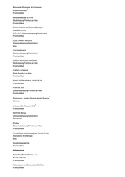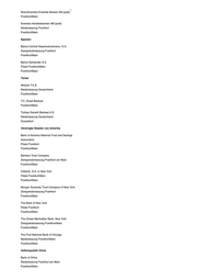 *) Skandinaviska Enskilda Banken AB (publ) Frankfurt/Main Svenska Handelsbanken AB (publ) Niederlassung Frankfurt Frankfurt/Main Spanien Banco Central Hispanoamericano, S.A. Zweigniederlassung Frankfurt Frankfurt/Main Banco Santander S.A. Filiale Frankfurt/Main Frankfurt/Main Türkei Akbank T.A.S. Niederlassung Deutschland Frankfurt/Main T.C. Ziraat Bankasi Frankfurt/Main Türkiye Garanti Bankasi A.S. Niederlassung Deutschland Düsseldorf Vereinigte Staaten von Amerika Bank of America National Trust and Savings Association Filiale Frankfurt Frankfurt/Main Bankers Trust Company Zweigniederlassung Frankfurt am Main Frankfurt/Main Citibank, N.A. in New York Filiale Frankfurt/Main Frankfurt/Main Morgan Guaranty Trust Company of New York Zweigniederlassung Frankfurt Frankfurt/Main The Bank of New York Filiale Frankfurt Frankfurt/Main The Chase Manhattan Bank, New York Zweigniederlassung Frankfurt/Main Frankfurt/Main The First National Bank of Chicago Niederlassung Frankfurt/Main Frankfurt/Main Volksrepublik China Bank of China Niederlassung Frankfurt am Main Frankfurt/Main