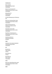Großbritannien Bank of Scotland Zweigniederlassung Frankfurt Frankfurt/Main Bankers Trust International PLC Zweigniederlassung Frankfurt am Main Frankfurt/Main Barclays Bank PLC Frankfurt Branch Frankfurt/Main Ford Bank Niederlassung der FCE Bank plc Köln Merrill Lynch International Bank Limited Zweigniederlassung Frankfurt am Main Frankfurt/Main National Westminster Bank Plc Niederlassung Frankfurt am Main Frankfurt/Main NationsBank Europe Limited Zweigniederlassung Frankfurt am Main Frankfurt/Main Royal Bank of Canada Europe Ltd. Zweigniederlassung Frankfurt am Main Frankfurt/Main West Merchant Bank Ltd. Niederlassung Düsseldorf Düsseldorf Indien State Bank of India (Indische Staatsbank) Zweigniederlassung Frankfurt Frankfurt/Main Iran Bank Melli Iran Filiale Hamburg Hamburg Bank Saderat Iran Hamburg Bank Sepah-Iran Filiale Frankfurt Frankfurt/Main Irland Merrill Lynch Capital Markets Bank Limited Zweigniederlassung Frankfurt am Main Frankfurt/Main Italien
