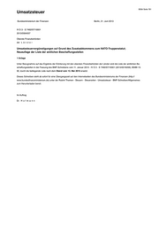 BStbl Seite 781 Umsatzsteuer Bundesministerium der Finanzen Berlin, 21. Juni 2013 IV D 3 - S 7492/07/10001 2013/0584057 Oberste Finanzbehörden der L ä n d e r Umsatzsteuervergünstigungen auf Grund des Zusatzabkommens zum NATO-Truppenstatut; Neuauflage der Liste der amtlichen Beschaffungsstellen 1 Anlage Unter Bezugnahme auf das Ergebnis der Erörterung mit den obersten Finanzbehörden der Länder wird die Liste der amtlichen Be‐ schaffungsstellen in der Fassung des BMF-Schreibens vom 11. Januar 2013 - IV D 3 - S 7492/07/10001 (2013/0019209), BStBl I S. 92, durch die beiliegende Liste nach dem Stand vom 13. Mai 2013 ersetzt. Dieses Schreiben steht ab sofort für eine Übergangszeit auf den Internetseiten des Bundesministeriums der Finanzen (http:// www.bundesfinanzministerium.de) unter der Rubrik Themen - Steuern - Steuerarten - Umsatzsteuer - BMF-Schreiben/Allgemeines zum Herunterladen bereit. Im Auftrag Dr. H o f m a n n