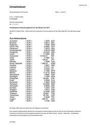 BStbl Seite 785 Umsatzsteuer Bundesministerium der Finanzen Berlin, 1. Juli 2013 IV D 3 - S 7329/13/10001 2013/0628860 Oberste Finanzbehörden der L ä n d e r Umsatzsteuer-Umrechnungskurse für den Monat Juni 2013 Gemäß § 16 Absatz 6 Satz 1 UStG werden die Umsatzsteuer-Umrechnungskurse für den Monat Juni 2013 wie folgt bekannt gege‐ ben: Die übrigen Währungen sind jeweils nach dem Tageskurs umzurechnen. Eine monatlich fortgeschriebene Übersicht der Umsatzsteuer-Umrechnungskurse steht ab sofort auf den Internetseiten des Bundes‐ ministeriums der Finanzen (www.bundesfinanzministerium.de) unter der Rubrik Themen - Steuern - Steuerarten - Umsatzsteuer - Umsatzsteuer-Umrechnungskurse zum Herunterladen bereit. Im Auftrag