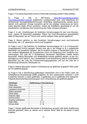 Landtag Brandenburg Drucksache 6/11287 Zu Frage 7: Im Rahmen der Sicherung der forstlichen Genressourcen sowie der Verwen- dung gebietsheimischer Gehölze werden seltene und gefährdete Baumarten gezielt beern- tet, angezogen und insbesondere im Rahmen von Ausgleichs- und Ersatzmaßnahmen gepflanzt. Die Anlage von Waldrändern wird gefördert und ist an die Verwendung heimi- scher Gehölze gebunden. In den letzten 5 Jahren wurde die Anlage von ca. 21 km Wald- rand gefördert. Die Gehölzzusammensetzung variiert nach Vorhaben und Standort. Weite- re Angaben werden nicht erfasst und liegen somit der Landesregierung nicht vor. -3-