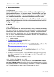 IKT-Dienstanweisung des BMU April 2019 schutzbeauftragten und des IKT-Referats zur Nutzung des dienstlichen E-Mail-Ac- counts“ im Intranet <http://intranet/Beauftragte/Datenschutzbeauftrag- ter/eMail/Documents/InformationPrivateEMailsFeb15.pdf> sind zu beachten. 6.4 Größenbeschränkungen von E-Mails Der E-Mail-Verkehr des BMU wird über das abgesicherte Regierungsnetz Informati- onsverbund-Berlin-Bonn (IVBB) bzw. Netze des Bundes (NdB) realisiert. Die Größe einer E-Mail ist seitens des IVBB/NdB beschränkt. Basis dieser Beschränkung ist ein Beschluss des Steuerungsausschusses IVBB/NdB, der für eingehende Mails aus dem Internet eine maximale Größe zulässt, der aktuelle Wert kann im Intranet eingesehen werden Zum Zeitpunkt der Veröffentlichung beträgt der Grenzwert 9 MB. Diese Vor- gabe ist für das BMU verbindlich. Die Zahl der als Anlage beigefügten Dateien soll auf das notwendige Maß beschränkt werden. Die Anzahl der beigefügten Dateien soll im Mail-Anschreiben genannt wer- den, um dem/n Empfänger/n die Möglichkeit der Überprüfung zu geben. Allen IT-Nutzerinnen und –Nutzern steht das Programm 7-Zip zur Verfügung, mit dem eine oder mehrere Dateien in sogenannten Archiven zusammengefasst (‚ge- packt’ = ‚gezipt’) werden können. Bei der Erstellung von Archiven werden die Dateien zudem komprimiert, d.h. sie werden kleiner und benötigen weniger Speicherplatz. Für Auskünfte über Möglichkeiten und Grenzen im Maildienst steht Ihnen der IT-Be- nutzerservice <IT-Benutzerservice@bmu.bund.de> zur Verfügung. 6.5 Postfach der Organisationseinheit (Referatspostfach) Referatspostfächer sind für jede Organisationseinheit eingerichtet. Die Pflege des Re- feratspostfaches obliegt der Organisationseinheit. Eingangsempfänger für elektronisch an das Referatspostfach übermittelte Doku- mente ist die jeweilige Referatsleitung. Die Referatsleitung kann die Funktion an Mit- arbeiterinnen/ Mitarbeiter der Organisationseinheit übertragen. Die Leiterin/der Leiter einer Organisationseinheit stellt sicher, dass das Postfach der Organisationseinheit mehrfach täglich auf neue Eingänge geprüft wird. ZI5 Seite 20 von 28