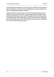IKT-Dienstanweisung des BMU April 2019 Zur Verhinderung des Missbrauchs wird der Zugang zu suspekten Internet-Adressen durch Einstellungen an zentralen Firewalls unterbunden und das Herunterladen von Dateien mit bestimmten Endungen verhindert. Internet-Nutzerinnen/-Nutzer müssen sich nach Aufruf des Web-Browsers mit der Nutzerkennung und dem Passwort am zentralen Zugangsserver anmelden. Mit der erneuten Authentifizierung soll der Zugriff Unbefugter vermieden und insbesondere sichergestellt werden, dass Schadprogramme nicht unbemerkt mit den Berechtigun- gen der Nutzerin/des Nutzers einen Kommunikationsweg zwischen dem Arbeitsplatz- PC und externen Servern aufbauen können. ZI5 Seite 23 von 28