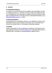 IKT-Dienstanweisung des BMU April 2019 9 Intranet 9.1 Zugangsberechtigung Der Zugang zum Intranet des BMU steht grundsätzlich allen Beschäftigten des BMU zur Verfügung. Externe (z. B. Vertreter von Firmen) erhalten den Zugang zum Intra- net nach Maßgabe der ihnen übertragenen Aufgaben auf Antrag der fachlich zustän- digen Organisationseinheit. Der Antrag ist über die zuständige Referatsleitung an IT- Benutzerkonto@bmu.bund.de zu richten. 9.2 Informationspflicht Alle Mitarbeiterinnen und Mitarbeiter informieren sich regelmäßig im Intranet. Veröf- fentlichungen werden auf der Startseite des Intranets, die sich automatisch beim Aufrufen des Intranets öffnet, in chronologischer Reihenfolge angezeigt. 9.3 Inhalte Fachlich verantwortlich für die einzustellenden Informationen ist die jeweils zustän- dige Organisationseinheit. Sie hat sicherzustellen, dass notwendige Änderungen und Aktualisierungen unverzüglich der Intranet-Redaktion mitgeteilt werden. ZI5 Seite 24 von 28